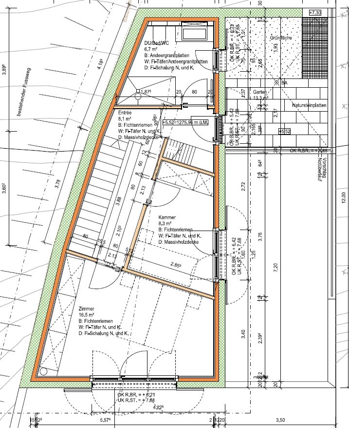 Im gesamten Haus wurde ein hochwertiger Parkettboden verlegt, der den Räumen eine warme und elegante Atmosphäre verleiht. Echtholztüren sowie die sichtbaren Dachbalken unterstreichen den charmanten Charakter und sorgen für ein behagliches Wohngefühl.
